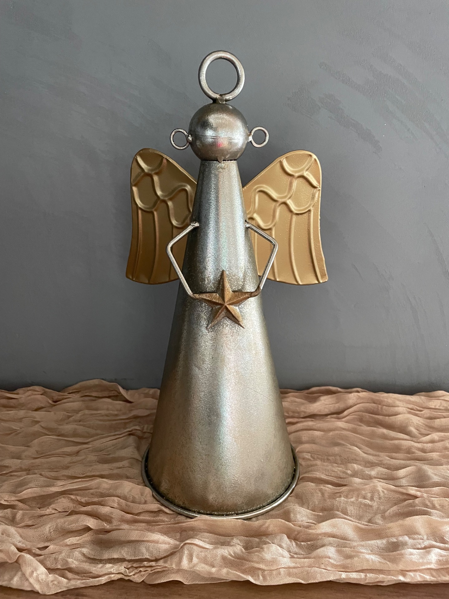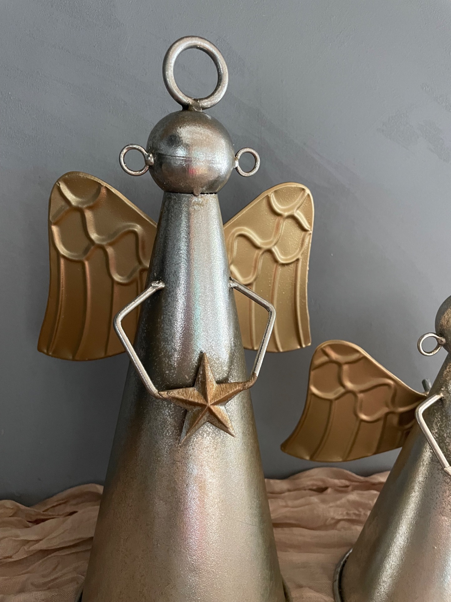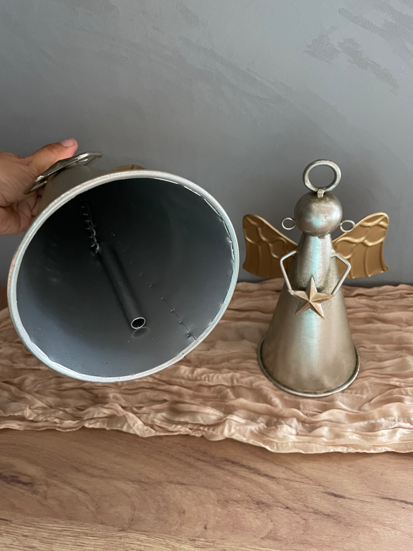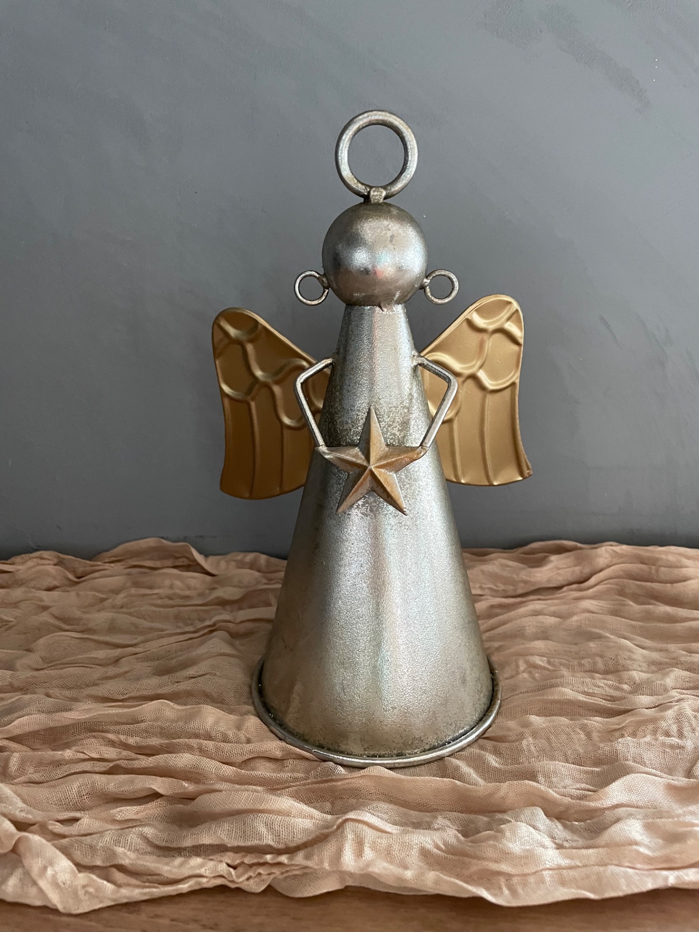 Kovový zvon v podobě anděla ve stříbrné barvě se zlatými křídli a hvězdou.