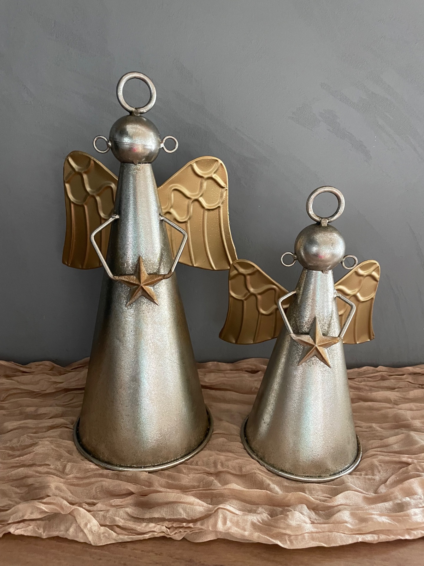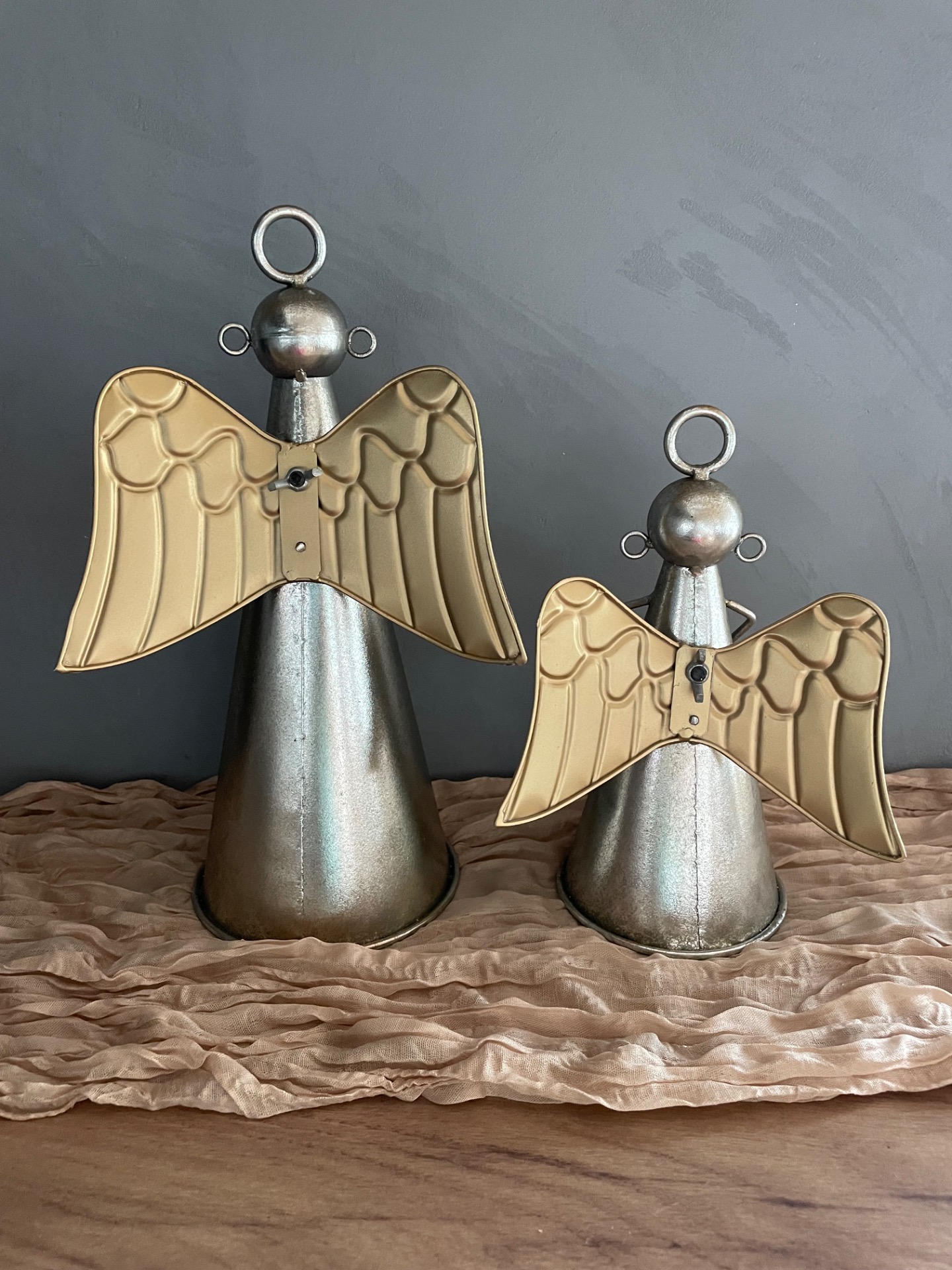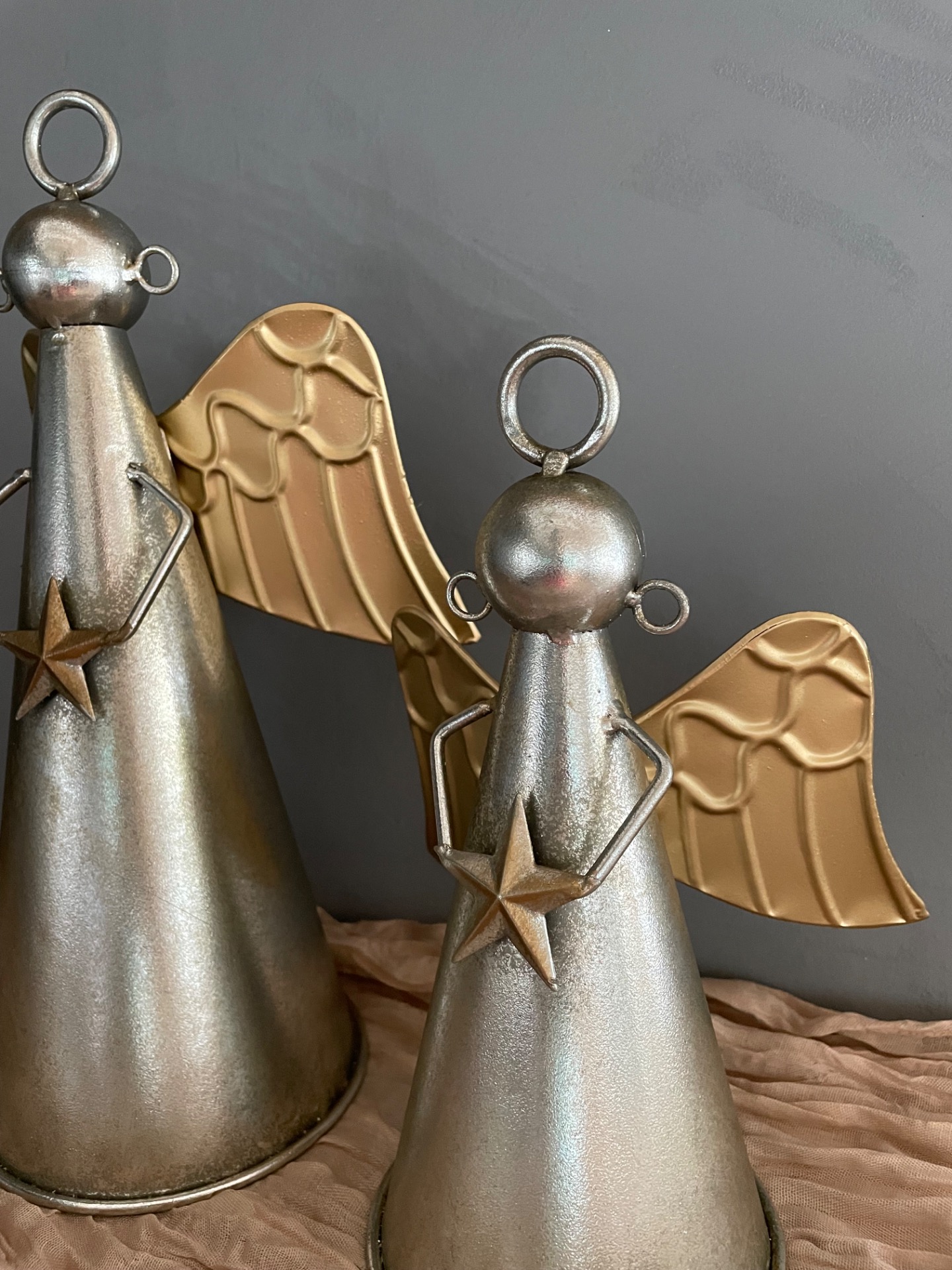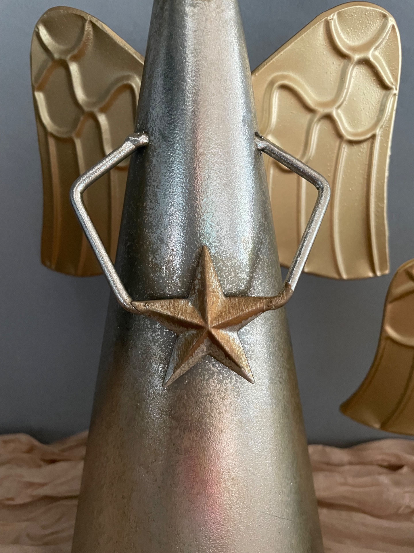 Kovový zvon v podobě anděla ve stříbrné barvě se zlatými křídli a hvězdou.