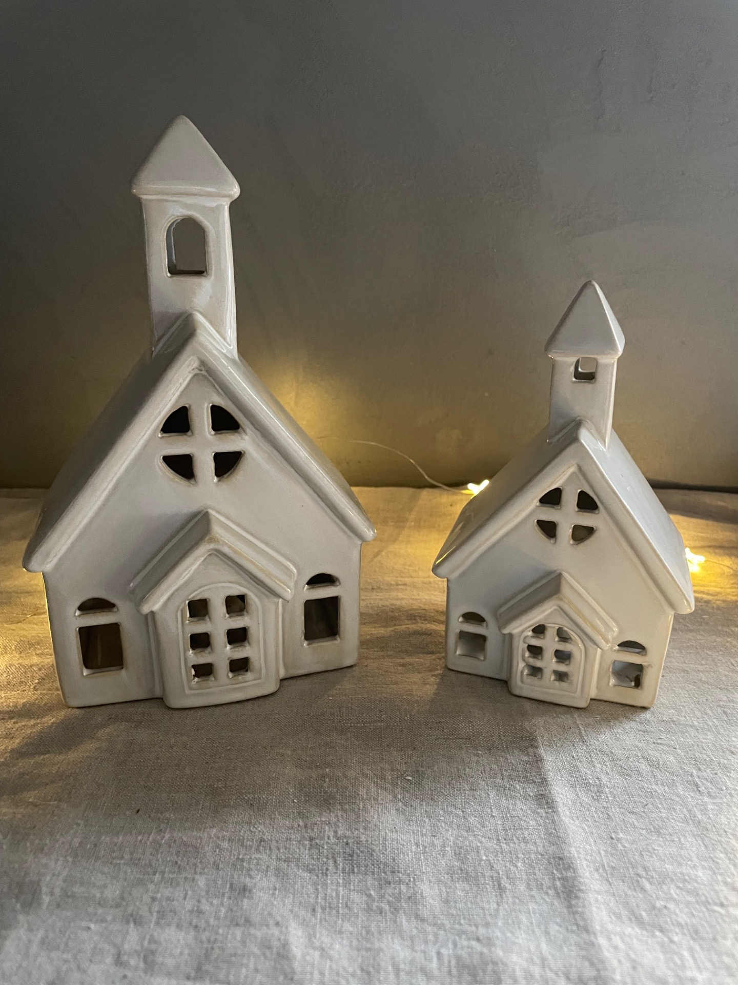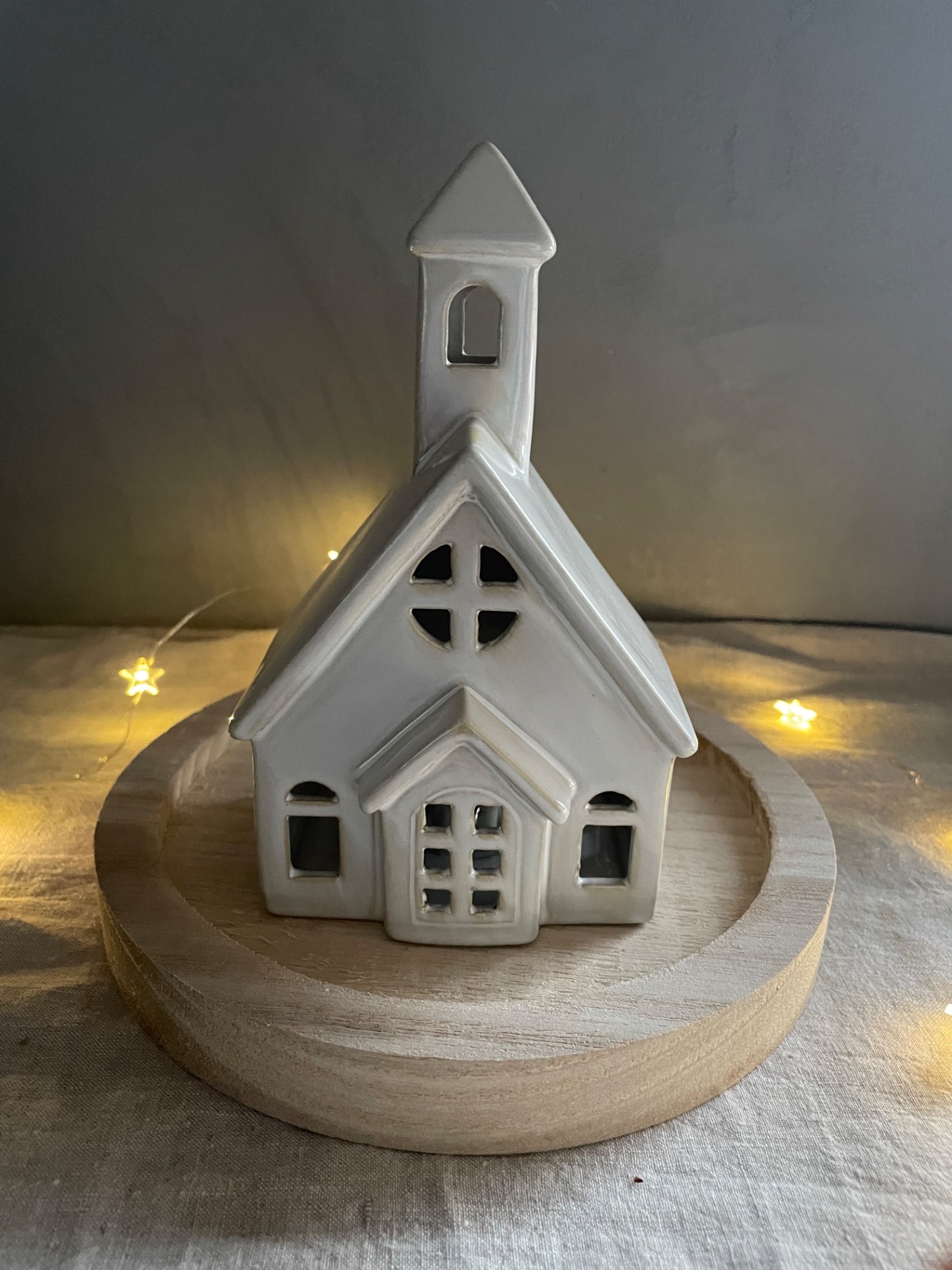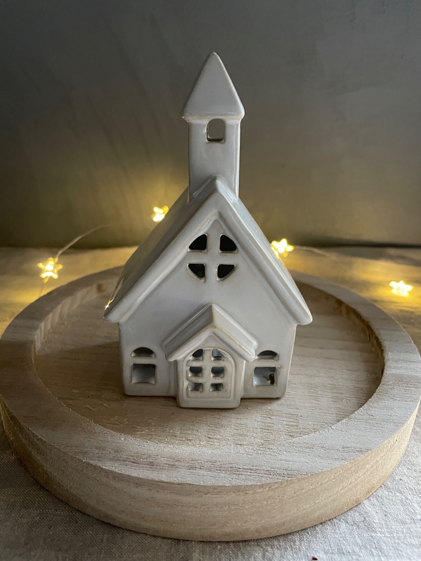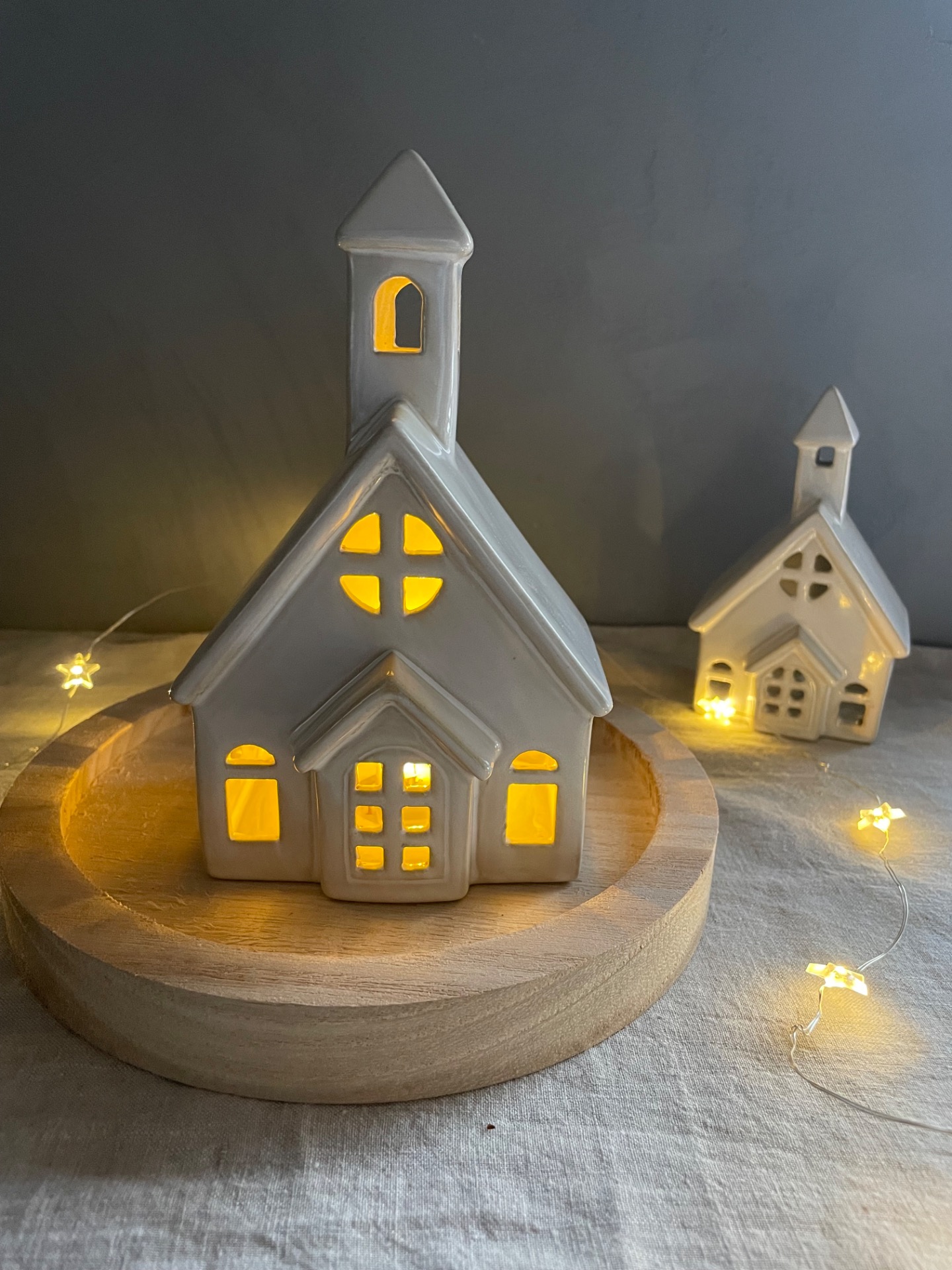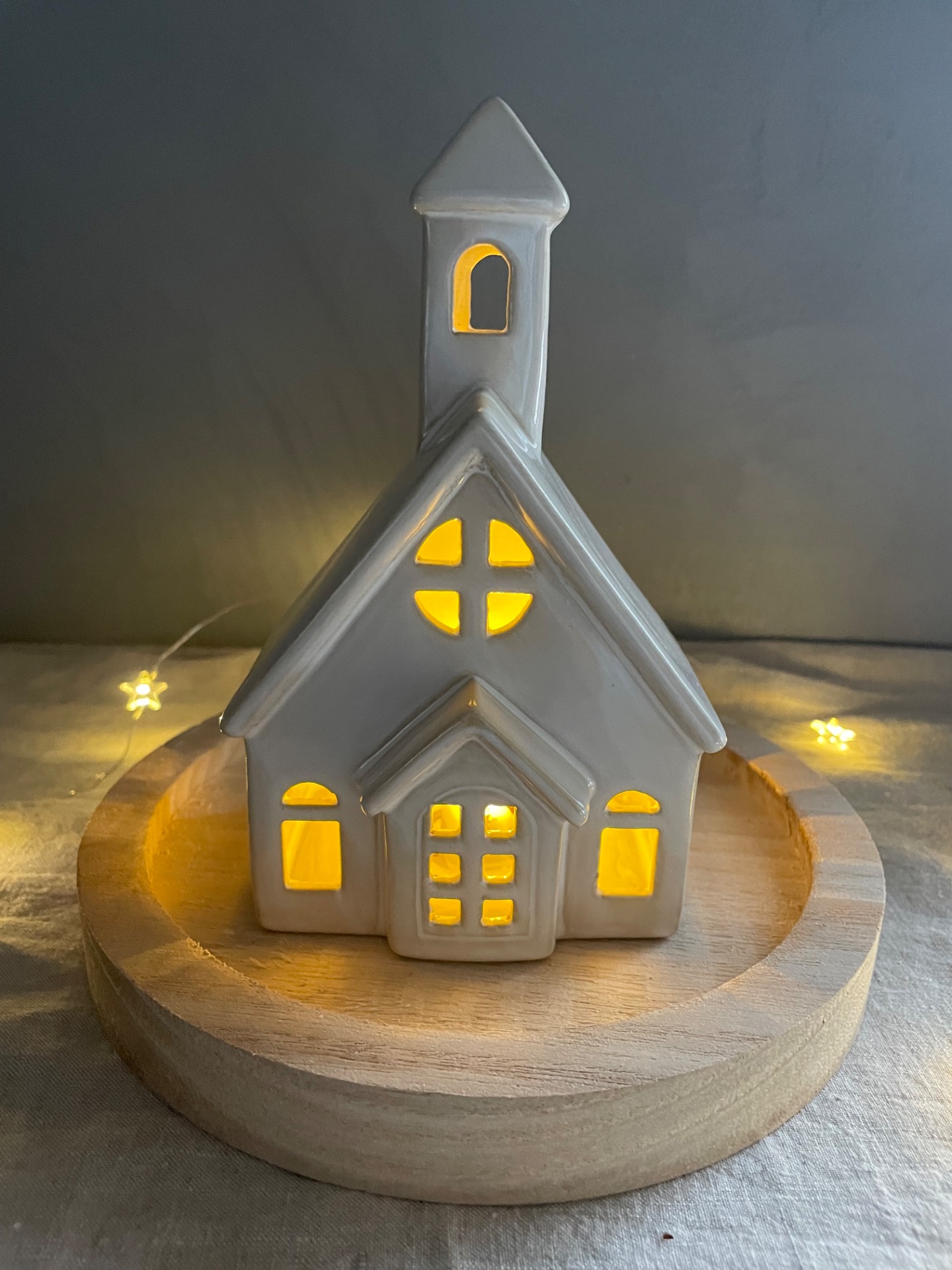 Kostelíček s LED osvětlením na baterie vhodný k dekoraci.
