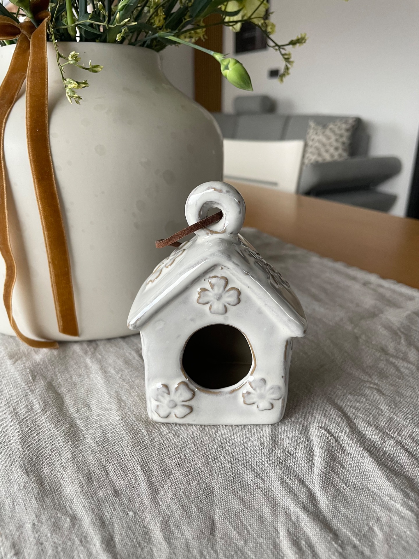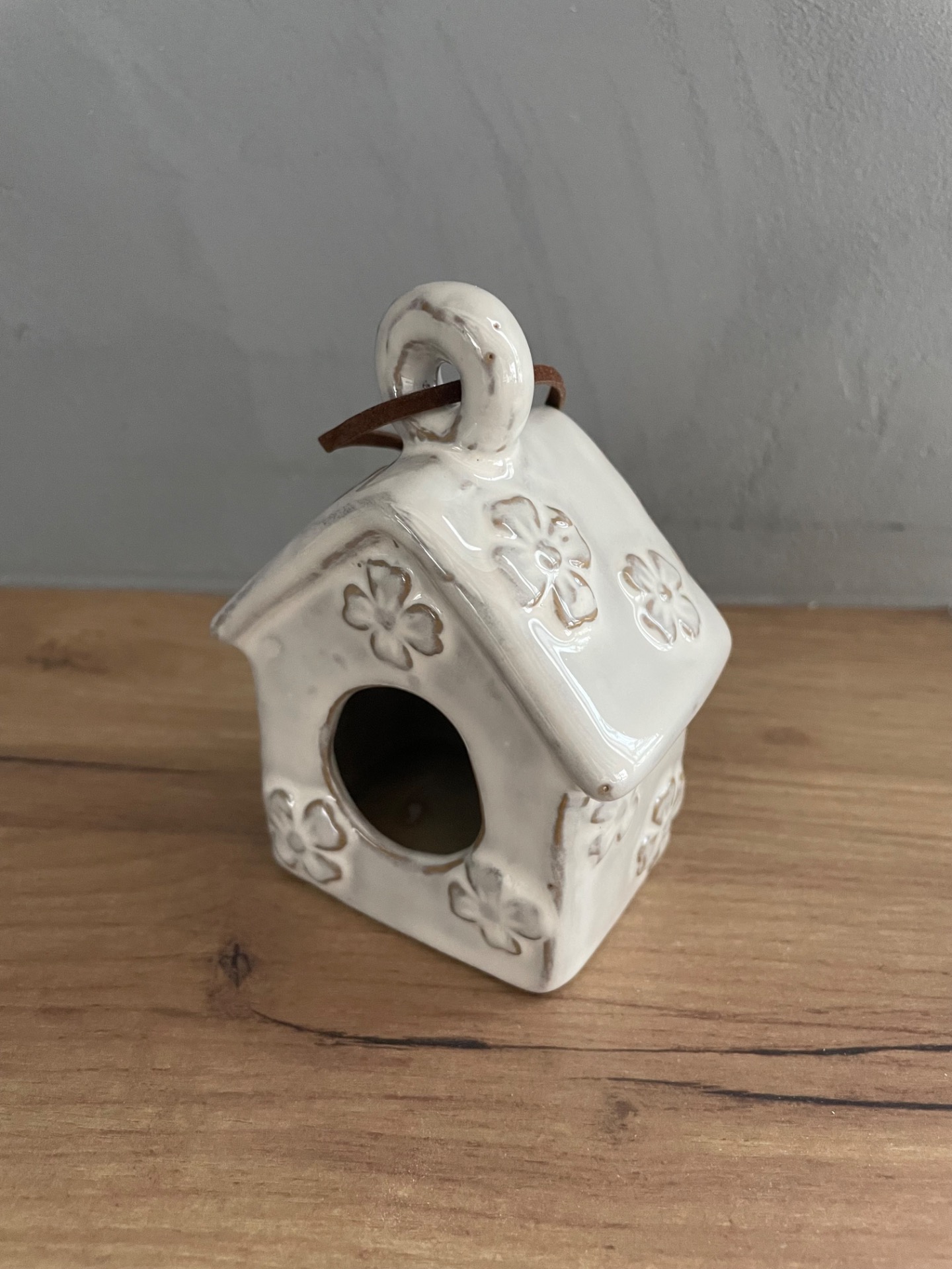 Závěsná porcelánová budka s květinami s koženým poutkem. Minimalistická, nežná dekorace vhodní k zavěšení a jarnímu dekorování.