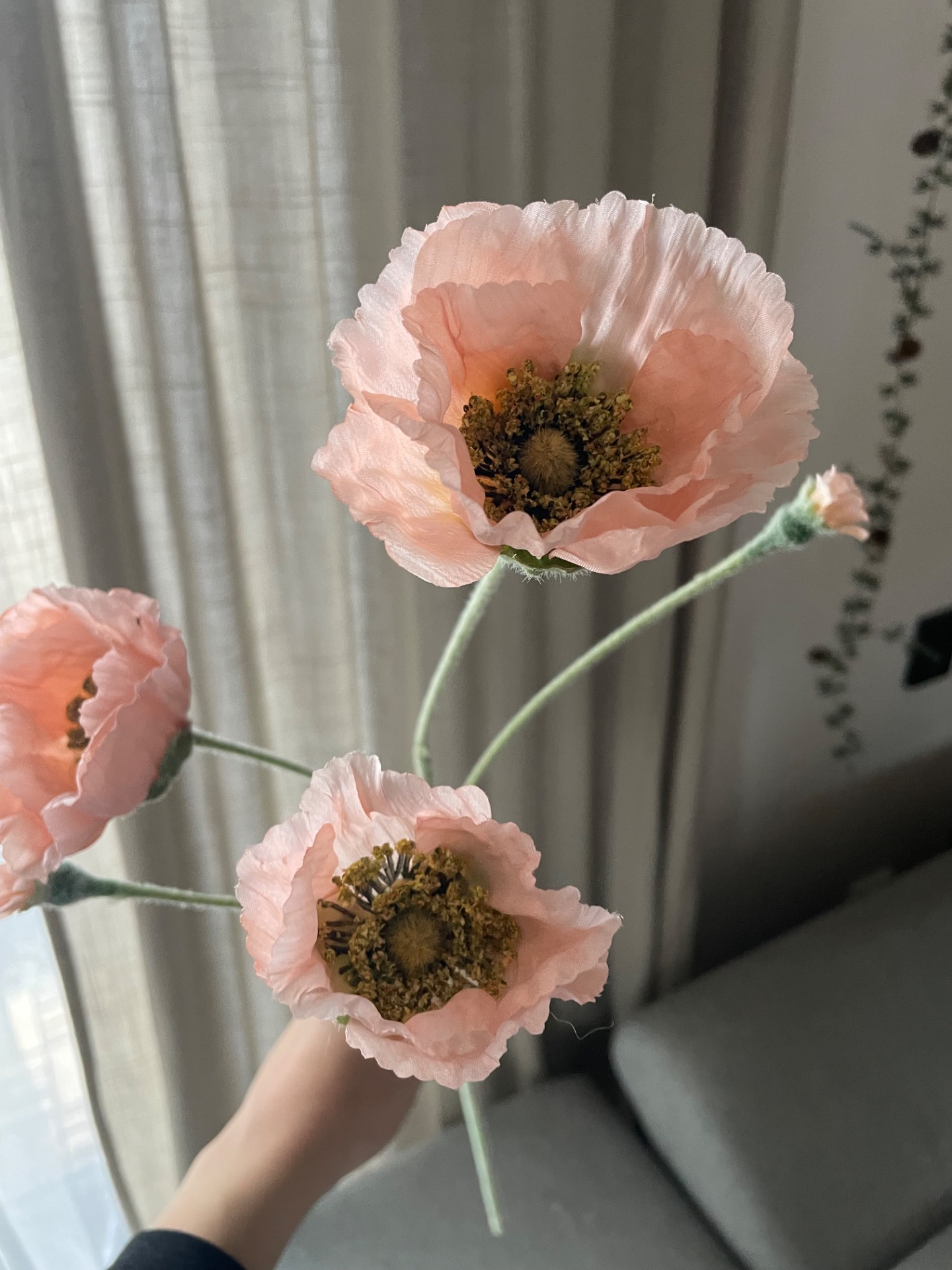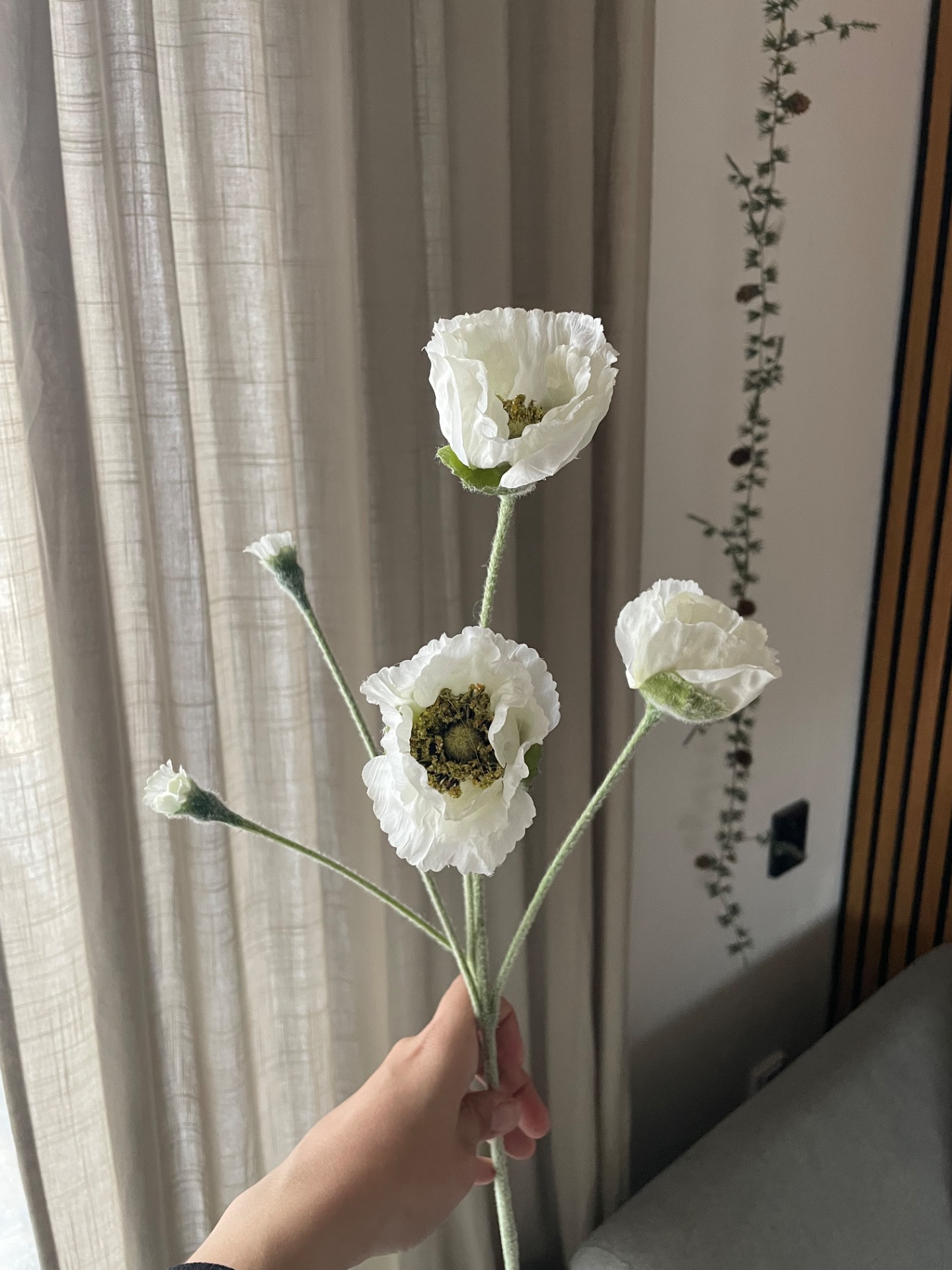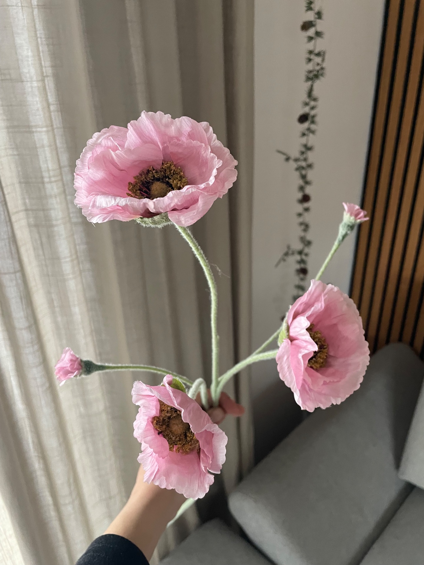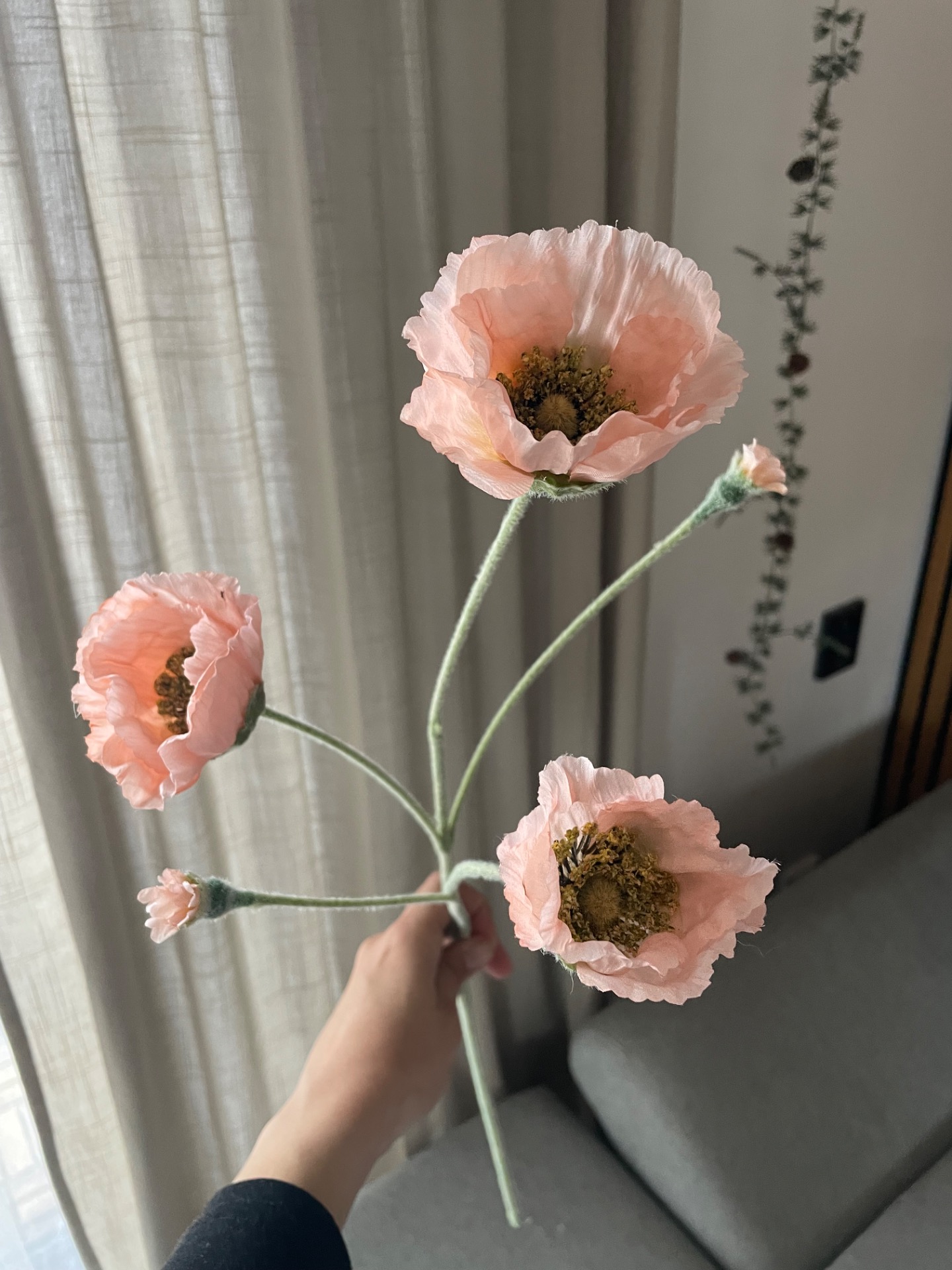 Umělá větev v designu vlčího máku v prvotřídním zpracování. Větev obsahuje 3 velké květy a 2 méně rozvinuté. Celý povrch stonku je potažen sametovým materiálem, díky kterému vypadají opravdu realisticky.