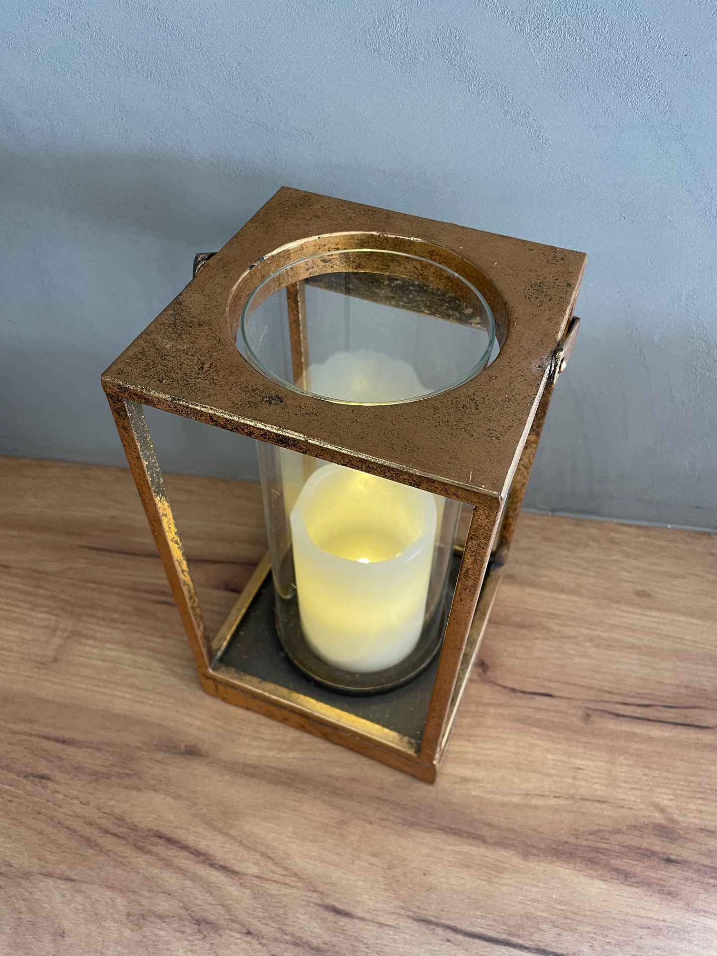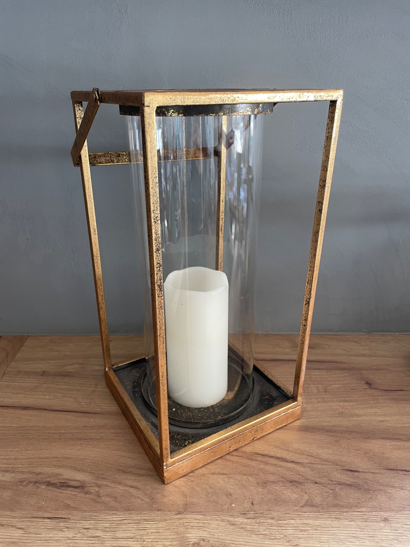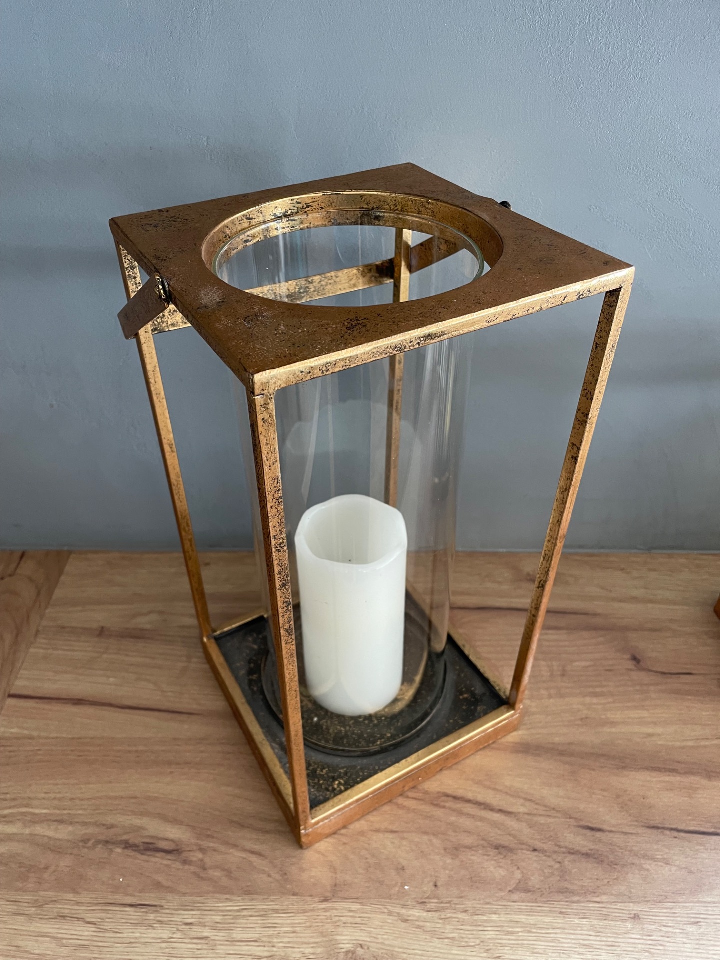 Nádherná moderní lucerna ve zlaté barvě se skleněnou vložkou k umístění svíčky. Nádherná dekorace domu, bytu, terasy nebo vstupu do domu.