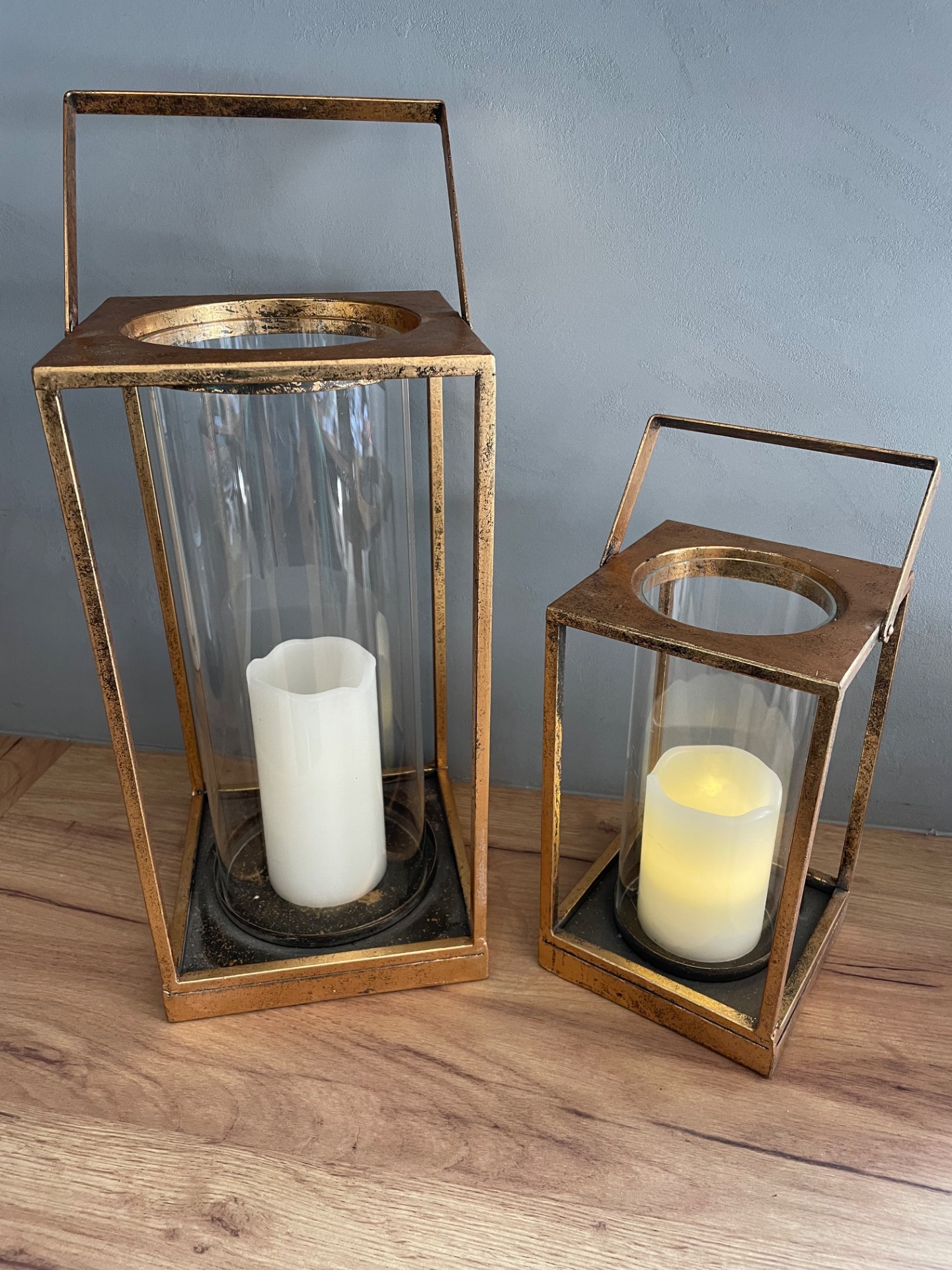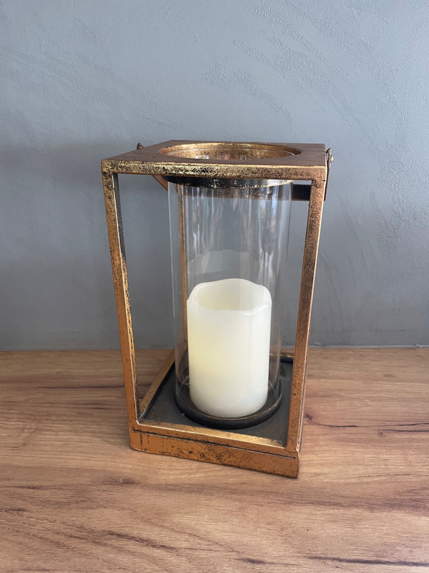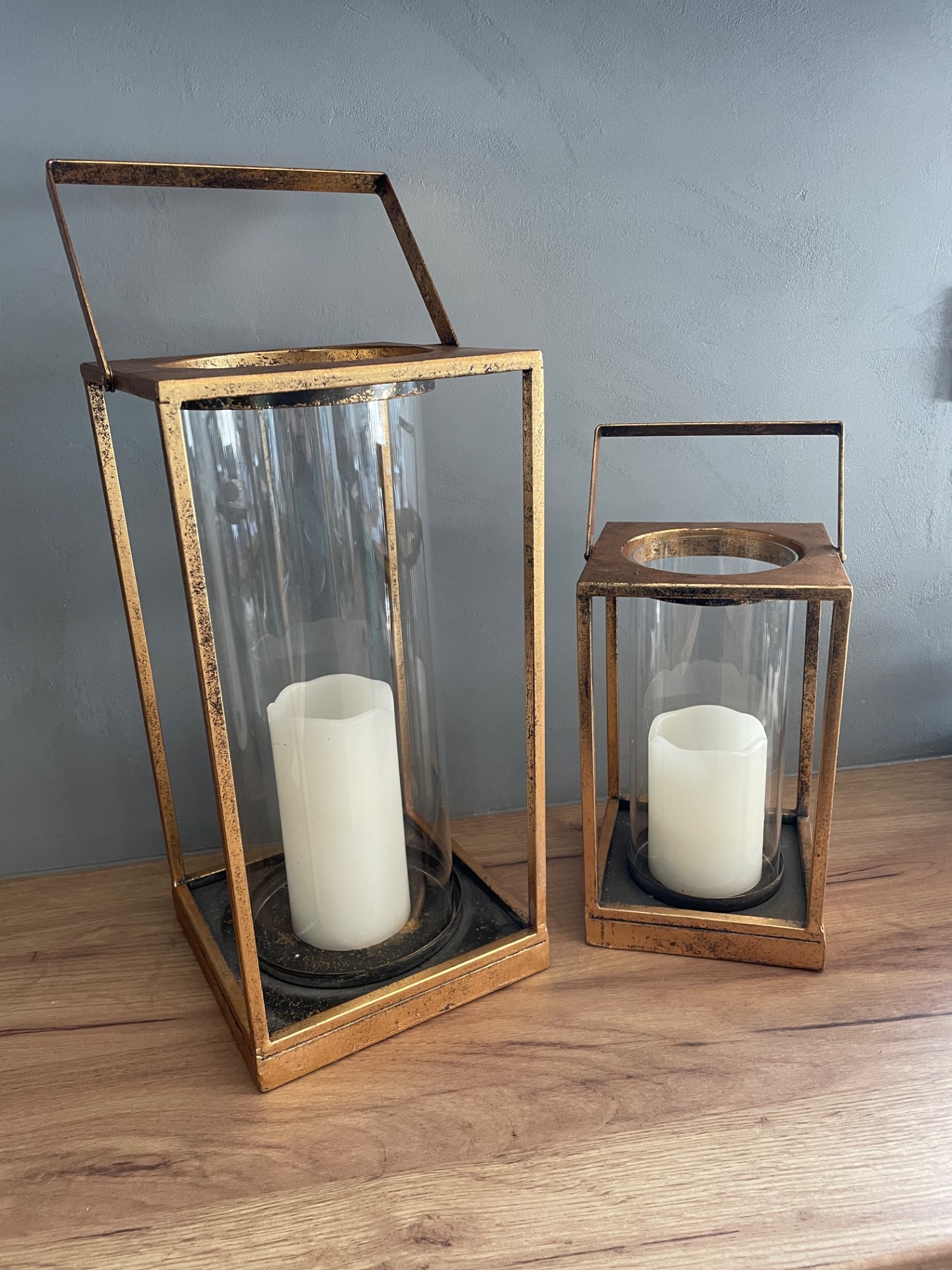 Nádherná moderní lucerna ve zlaté barvě se skleněnou vložkou k umístění svíčky. Nádherná dekorace domu, bytu, terasy nebo vstupu do domu.
